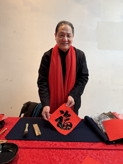 2月21日至23日,日本大阪文化馆·天保山,2026年大阪春节祭现场入口处,连着三天呈现这样的情景,成了最温馨、感人的一幕:在摆放着纸墨的书桌前,只见许多驻足者或手持四方红纸上用毛笔写就的“福”字,或拿着端庄大气、用词年味十足的春联,满脸兴奋地跟书写者合影。这一切,都缘于这些“福”字和对联的书写者,原来是一位书法大家——旅日著名书画家,清华大学学美术学院客座教授、现任日中文化艺术专门学校客座教授的刘铭义先生!