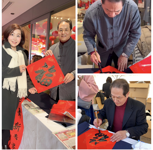 ▲资料:2024年、2025年,刘铭义在大阪春节祭现场为中日民众写“福”字和春联并与观众合影照片
