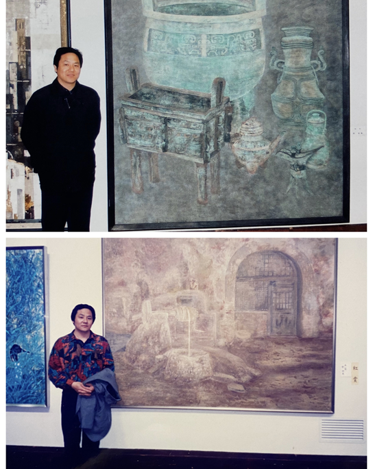 ▲资料:刘铭义在自己入选创画展(上)和获红赏作品(下)前留影