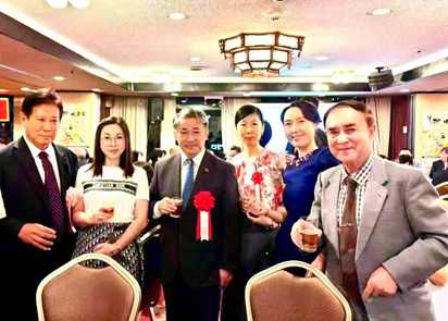 ▲本文作者(右一)出席国庆76周年晚会时与中国驻大阪总领事薛剑(左三)、副总领事魏有美(右三),中华料理“枫林阁”现任社长赵知理(左一)等合影留念