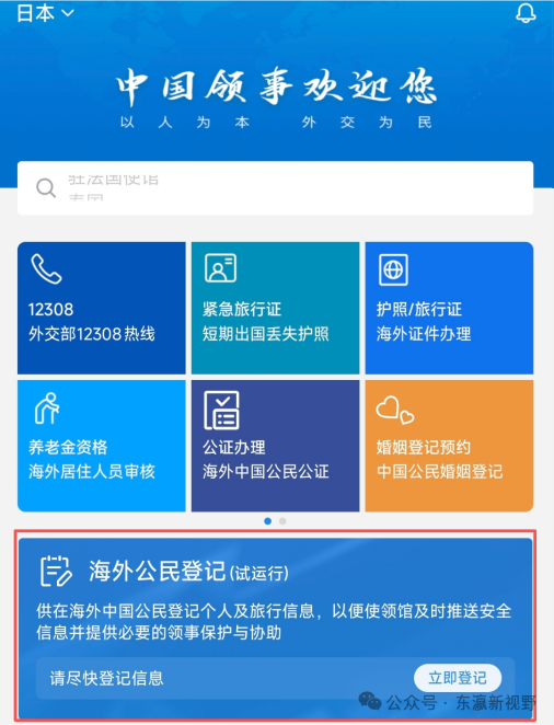 为有效保护在日中国公民人身安全,进一步帮助在日中国公民更好获得领事保护与服务,外交部“中国领事”APP推出“海外公民登记”功能模块并已全面上线。中国驻日本大使馆提醒在日中国公民: