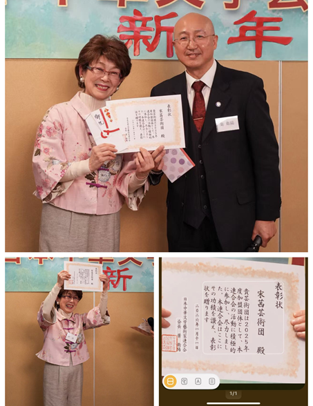 本次新年会活动还包括三个重要环节,一是根据连合会章程,已经连任两届会长的叶卫阳当天正式任期届满,结束第五任会长一职,经艺委会一致推举,自2026年起,傅巍当选为新一届即第六任日本中华文学艺术家连合会会长,原由傅巍担任的事务局长一职由宋茜担任;二是宣布成立日本中华文学艺术促进后援会,刚刚当选的后援会会长田露在致辞中简要介绍了后援会主要工作,包括为中日文化艺术大型活动开展前期宣传、沟通赞助商、艺术家营销和经纪、艺术教育、文化大讲堂等;三是由现任会长叶卫阳正式宣布“2025年协力奖”获得者名单,叶卫阳会长还亲自将“2025年度连合会最活跃最积极的艺术团”大奖颁发给了SONG茜艺术团团长宋茜女士。在会长交接环节,叶卫阳向连合会的各位艺术家表达了最诚挚的谢意,他同时表示:衷心希望各位老师今后能够一如既往地支持新任会长及新一届艺委会的工作。让我们携手并肩,把连合会这个大家庭办得更好、更有活力,不断发展壮大,薪火相传,发扬光大。