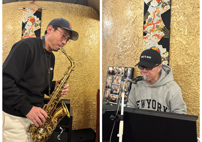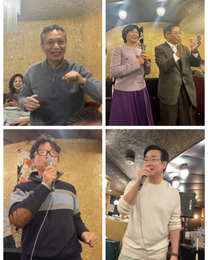 文艺表演也是新年会最吸引人的一部分。在上海开设有知名音乐酒吧、专程从上海赶来的音乐人刚刚与吴越配合,为大家演唱了经典歌曲“新不了情”和“月亮代表我的心”;先后毕业于上海音乐学院、东京爵士音乐专科学院的萨克斯演奏家吴越,系音协萨克斯研究会特聘顾问、上海爵士乐团首席、美国Theo Wanne特约艺术家、台湾Weissenberg形象代言人,2025年曾两次在「缘」餐厅开专场演奏会,他此次给大家带来了“Just the way you are”、“Chicken”两首经典萨克斯曲目;同样曾在「缘」餐厅唱响中国民歌的四川音乐学院教授蒋晓萌,也为大家献上了曾登上央视春晚的歌曲《美丽的心情》。为了活跃气氛,钱平会长、由佳副会长等四人也齐齐上阵,合唱了歌曲《甜蜜蜜》;而曾经在上海担任乐队主唱、现在活跃在大阪的网红“老古董在大阪”也主动走上前台,为大家演唱了热门歌曲。“大阪麦哥”、“老古董在大阪”、城傑士等还分别作了自我介绍及在日本的发展情况。