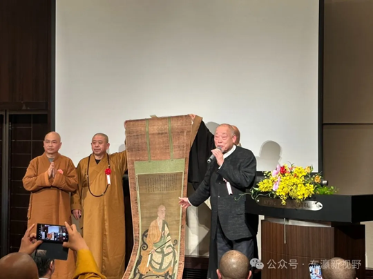研讨会的赠礼环节也引起了大家的兴趣。此前的2023年,西来院云林院宗硕法师一行在拜访兰溪道隆家乡时,受到当地佛协热情接待,并与蔺市文化展览馆约定要赠送一幅兰溪道隆禅师的画像。回国后,云林院宗硕法师找到制作、修复典籍的匠人大入百太郎大师,模仿西来院的兰溪道隆禅师画像实物复制了高精密的兰溪道隆禅师画像。当天,云林院宗硕法师、大入百太郎大师亲自向中国佛教协会代表团代表赠送了兰溪道隆禅师画像。