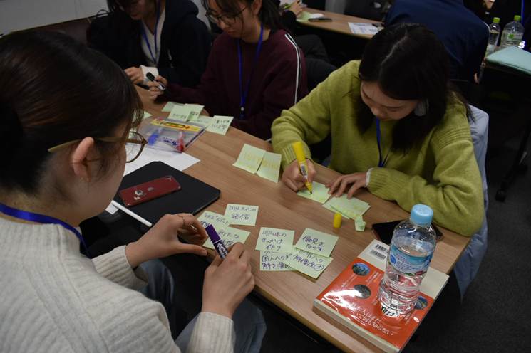第二天开展了活动企划工作坊。围绕“我们为什么要举办中日交流活动”这一问题,参与者运用KJ法整理个人想法,并在小组内汇总讨论,具体化活动目的与内容,反复推敲企划方向。通过深入讨论,各组围绕饮食、农业、时尚、地域文化、语言交流等贴近日常生活的主题进行策划,并进行了成果发表。
