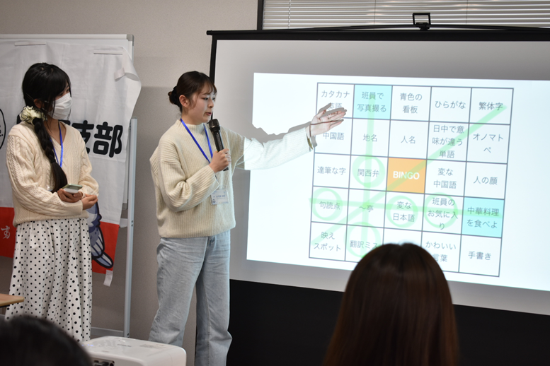 在最终发表中引发关注的“城市漫步宾果”活动企划,目前已被freebird关西支部列为重点推进项目之一。关西支部表示,将结合实际情况积极推动该活动在关西地区落地实施。该活动计划以城市街区为舞台,以宾果形式寻找与中国相关的元素,在熟悉的街景中发现交流契机。 据介绍,“城市漫步宾果”只是本次合宿中提出的多个创意企划之一。围绕饮食、地方文化、语言交流等主题的其他活动方案,也正在逐步梳理与完善中。主办方表示,将根据条件成熟度分阶段推进实施,让学生在合宿中形成的创意真正走向现实。(稿件提供:中日学生交流团体freebird)